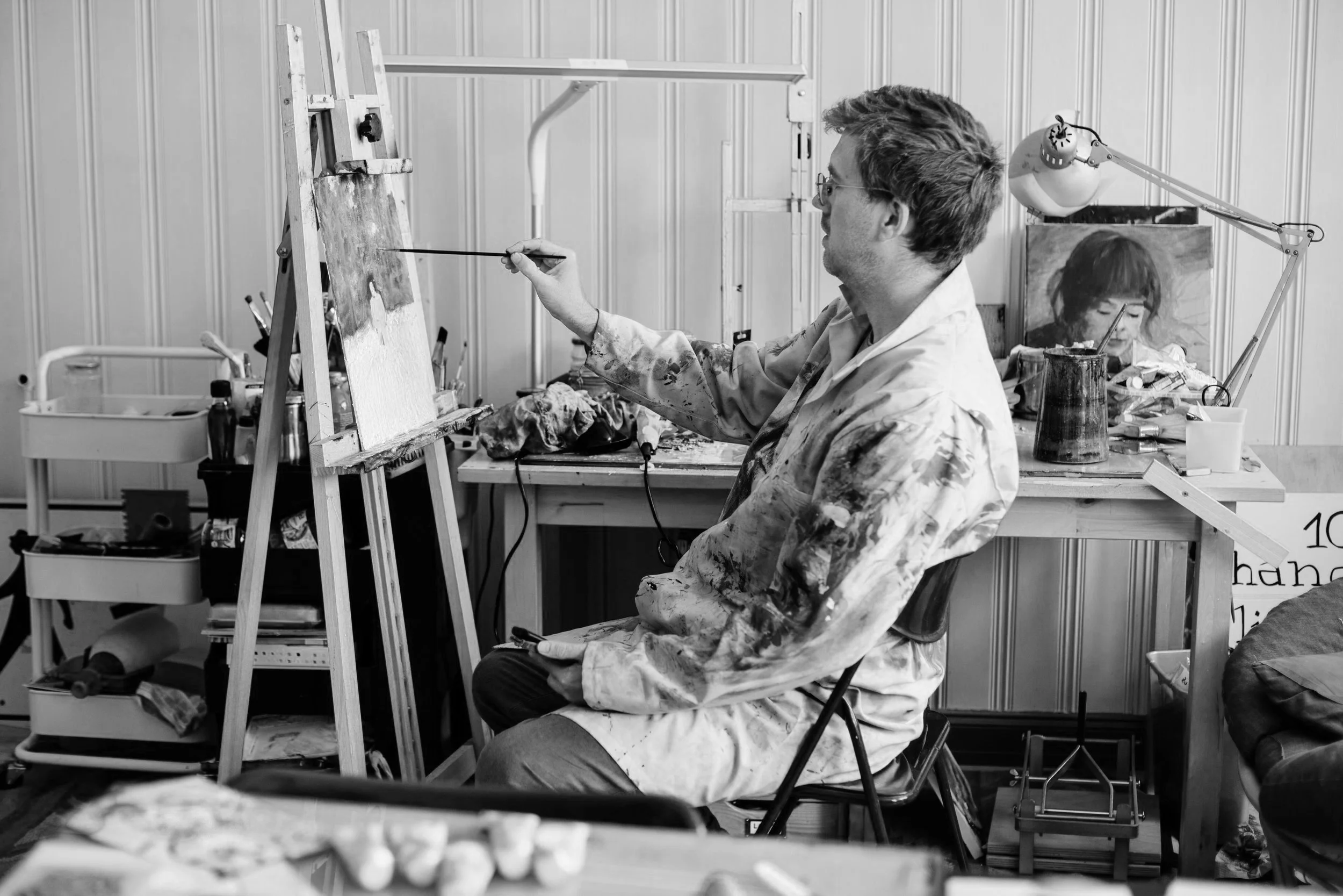 Jörn Haacks Bilder sind realistische Momentaufnahmen von Menschen ohne Masken, gepaart mit surrealen Elementen, wie dem Blattwerk, das die Untrennbarkeit von Mensch und Natur symbolisiert, oder dem Rauch, der für die Vergänglichkeit von Menschen, Gedanken und Augenblicken steht.